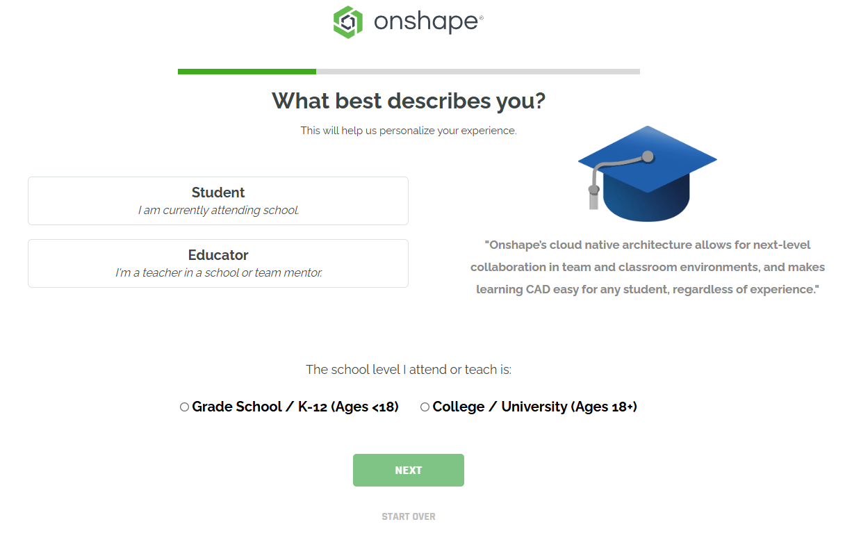 Allez sur la page www.onshape.com/en/education ou en cliquant sur le bouton Create EDU account.